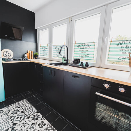 W strefie zmywania dostrzec można rozwiązania w kolorze grafitu, nawiązujące do stylistyki industrialnej – bateria Daru oraz zlewozmywak Chichi od marki Laveo. Zlewozmywak jednokomorowy został zastosowany jako rozwiązanie wręcz stworzone dla kuchni o naprawdę małej powierzchni. Jednocześnie ten model jest na tyle głęboki, że korzystanie ze strefy zmywania jest wygodne i nie powoduje rozlewania wody. Granit jest również odporny na szok termiczny czy różnego rodzaju zabarwienia, np. soku z buraka.