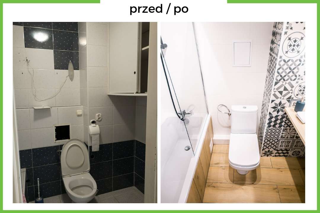Przed remontem, na pierwszy plan tej łazienki wysuwała się podwieszana szafka, która wykorzystywała dużo przestrzeni. Mimo, że stanowiła dodatkowe miejsce do przechowywania, zajmowała przestrzeń, która mogłaby służyć montażowi innych typowych rozwiązań łazienkowych, np. prysznica lub wanny. Autorka projektu zrezygnowała z tego elementu zabudowy. Dzięki temu zyskała przestrzeń na wiele możliwości, które zakładał projekt.