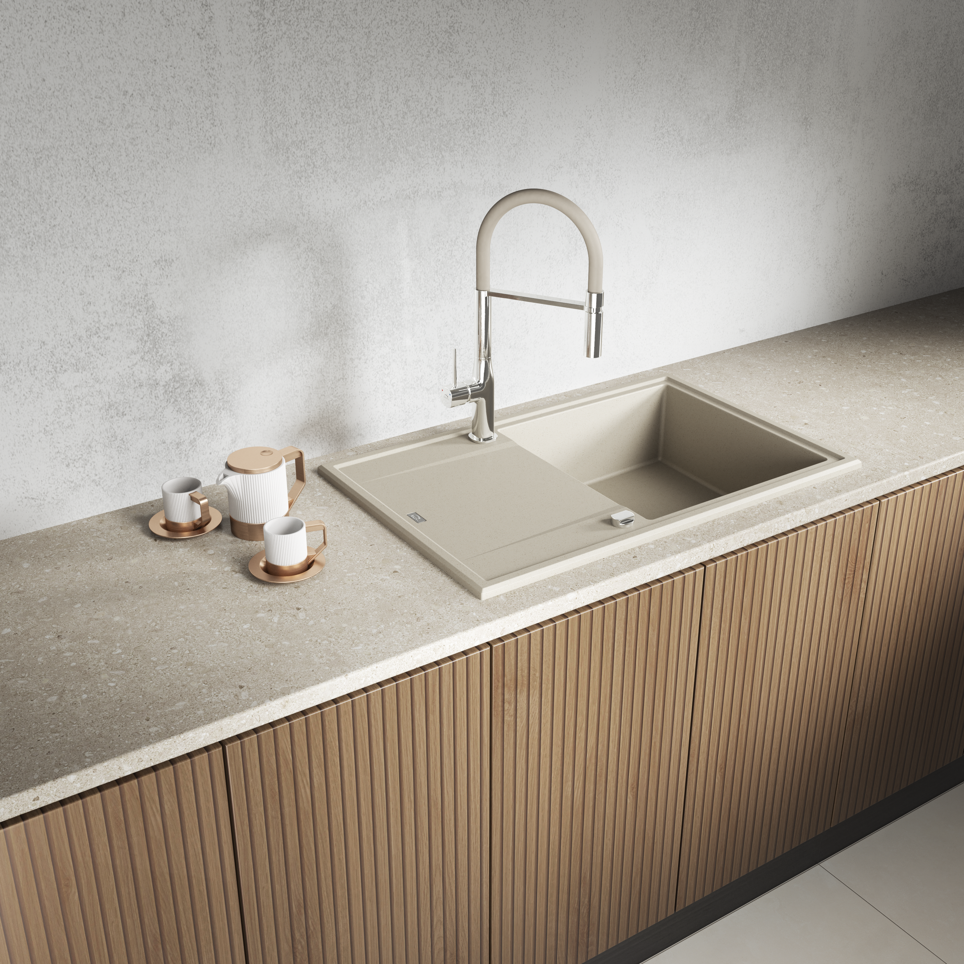 Bateria Pureco łączy nowoczesny design z codzienną wygodą użytkowania. Minimalistyczna forma w matowej czerni idealnie wpisuje się w estetykę współczesnych kuchni, oferując jednocześnie przemyślane rozwiązania techniczne.