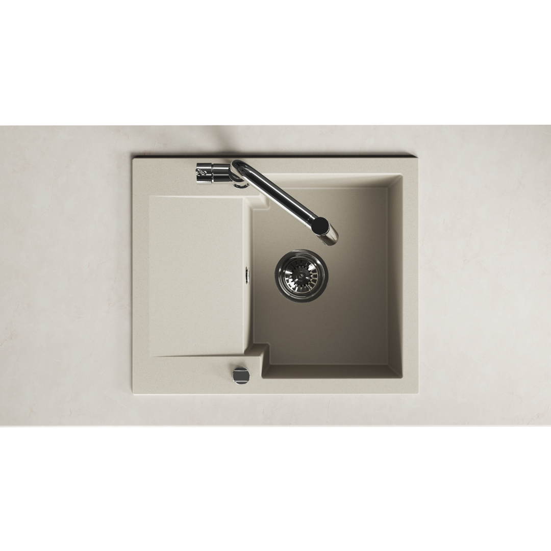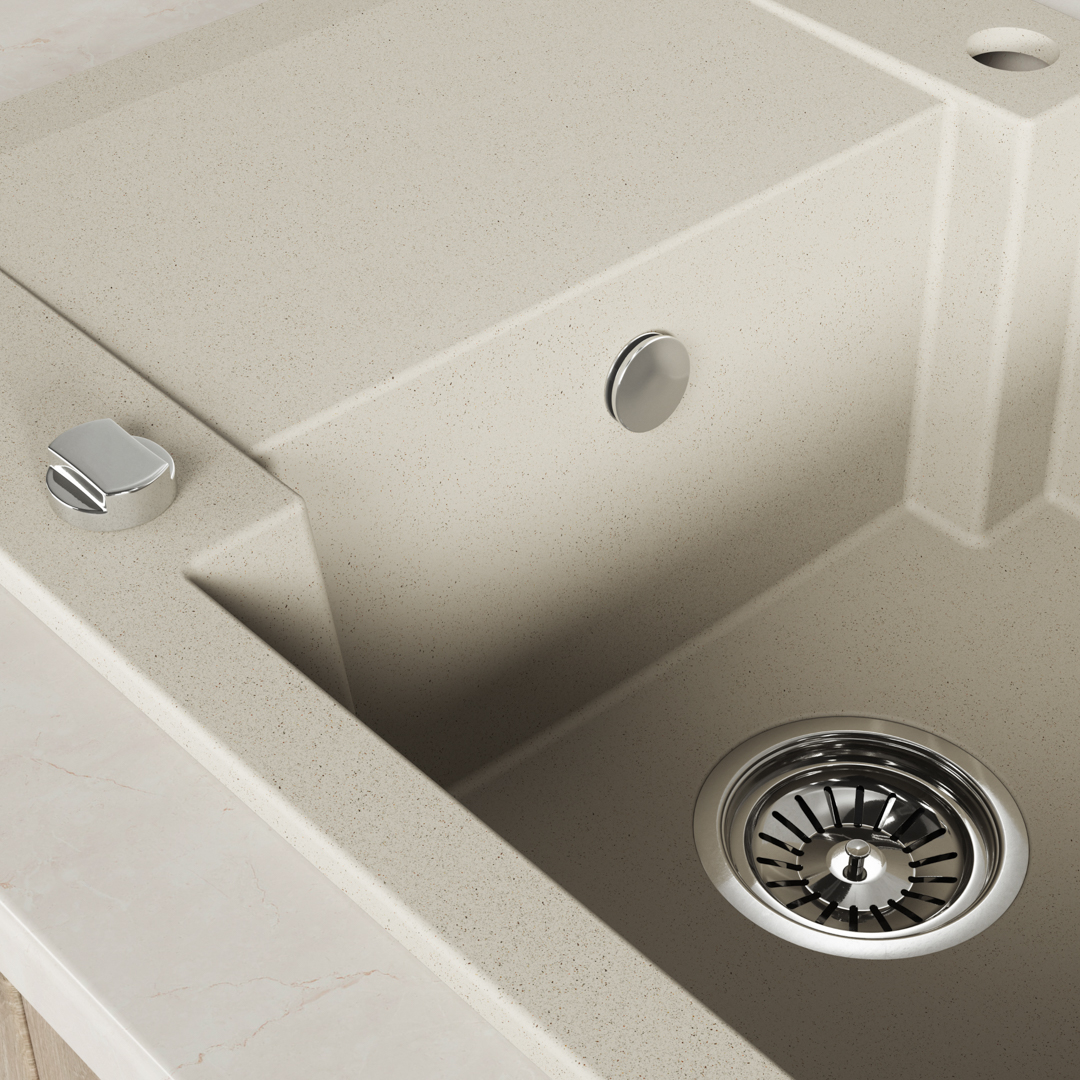 Jedes Modell der Serie Chichi ist mit einem Space-Saving-Siphon ausgestattet, der eine bequeme Aufbewahrung unter der Spüle ermöglicht und ideal für einen Mülleimer oder Reinigungsmittel ist. Die Spülen sind in drei eleganten Farben erhältlich – in Beige, Grau und Schwarz – und lassen sich so leicht in eine Vielzahl von Einrichtungen integrieren. Die Produkte der Serie werden mit einer 10-jährigen Garantie und einem Anfahrtsservice geliefert, die eine dauerhafte Qualität und einen hohen Komfort garantieren. Die Spülbecken Chichi sind resistent gegen Temperaturschocks, hohe Temperaturen, Schmutz und Stöße, und jedes Modell ist mit einem Klick-Klack-Stopfen und einem Sieb mit einem Durchmesser von 3,5 Zoll ausgestattet, um den Abfluss vor Speiseresten zu schützen.