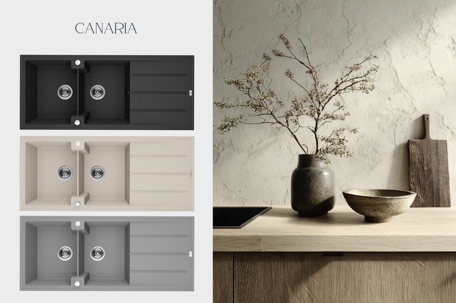 The Canaria series is a response to the needs of modern kitchens, where aesthetics go hand in hand with practicality. These granite sinks are designed with discerning users in mind—those seeking durable solutions with a timeless form. The geometric simplicity, carefully balanced proportions, and a nature-inspired palette—from warm beige through muted gray to deep black—make Canaria a harmonious fit for both contemporary and classic interiors.
