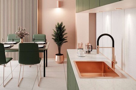 To underline a modern nature of the Marmara series, we made our best to ensure extraordinary finishes. For traditional and minimalistic kitchens the right choice are inox sinks which fit perfectly in chrome-finished fittings and household equipment. In contrast, a perfect match for industrial interiors are Marmara sinks in graphite version which will bring elegance into kitchen and match black mixers, considered the most trendy recently. Those who look for a more spectacular effect will most definitely like sinks in gold or copper colours. Each Marmara sink is sold together with a siphon and a manual plug in a colour matching the sink finishing.