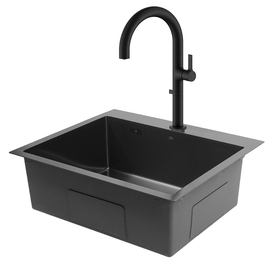 Malawi sinks can be installed either inset into the countertop or flush with its surface. The range also includes practical sets: with a soap dispenser, a draining insert, a roll-up drainer, and optionally with the Riveco kitchen mixer with a carbon filter or the Pureco mixer with a filtration system. The matte black mixer perfectly complements the industrial character of the collection, providing filtered water without plastic and convenient operation thanks to a dual lever.