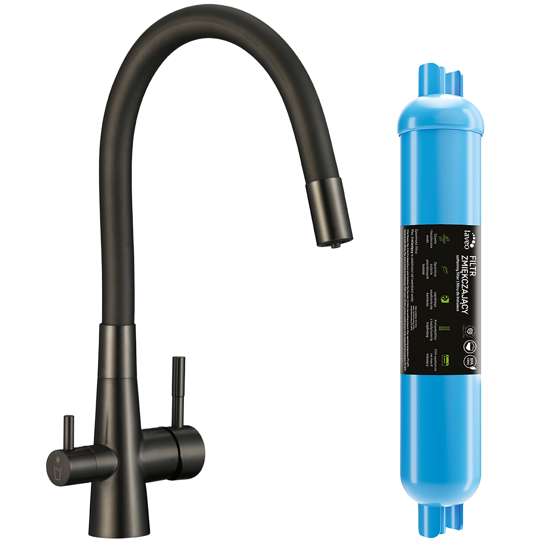 Bateria Riveco w eleganckim, grafitowym wykończeniu to nowoczesne rozwiązanie, które łączy funkcjonalność baterii kuchennej z systemem filtracji wody. Dzięki wbudowanemu filtrowi zmiękczającemu skutecznie redukuje twardość wody, usuwając jony wapnia i magnezu odpowiedzialne za powstawanie kamienia. Miękka woda to nie tylko lepszy smak i zapach, ale również dłuższa żywotność sprzętów AGD oraz czystsza armatura kuchenna.