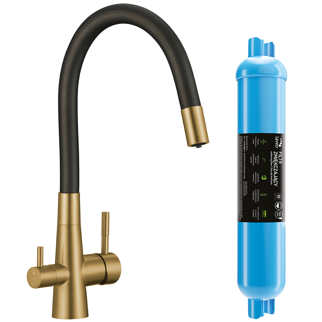 Bateria Riveco w wyjątkowym połączeniu złota szczotkowanego i czerni to propozycja dla osób, które cenią wysmakowany design i codzienną wygodę. Zintegrowany filtr zmiękczający skutecznie redukuje twardość wody, usuwając z niej jony wapnia i magnezu odpowiedzialne za powstawanie kamienia. W efekcie zyskujesz wodę o łagodnym smaku, która jest delikatna dla urządzeń i przyjazna dla skóry. Żywotność filtra wynosi maksymalnie 6 miesięcy i zależy od stopnia twardości wody.