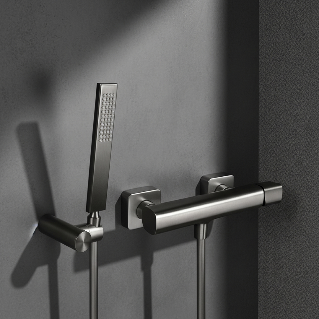Bateria natryskowa ścienna Tores w kolorze grafitowym wyróżnia się geometryczną formą korpusu o subtelnym kształcie kwadratu, która harmonijnie łączy się z prostą linią dźwigni.