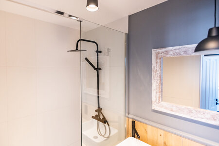 Matowy grafit doskonale współgra z ceramiką w odcieniach bieli, beżu czy piasku, a także z elementami kamienia, drewna i betonu.
