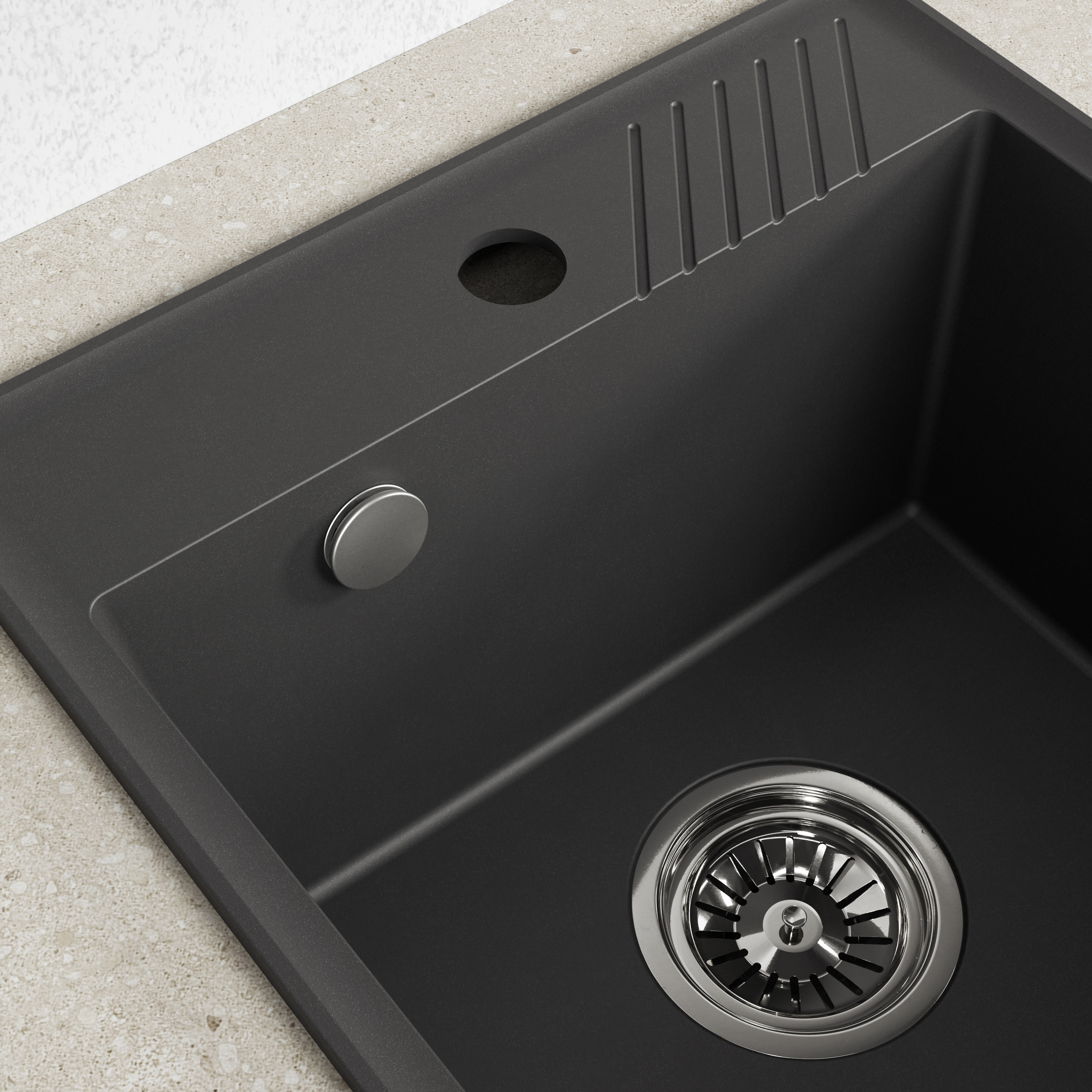 Zlewozmywak Hub wykonany jest z wysokiej jakości kompozytu granitowego Solid Quartz, który charakteryzuje się jednorodną strukturą na całej grubości materiału. Dzięki temu zlewozmywak jest wyjątkowo odporny na zarysowania, uderzenia oraz działanie wysokich temperatur i gwałtownych zmian termicznych. Czarna powierzchnia zachowuje swoją głębię koloru i satynowe wykończenie przez długi czas, nie ulegając przebarwieniom ani matowieniu nawet przy częstym kontakcie z wodą i środkami czystości.