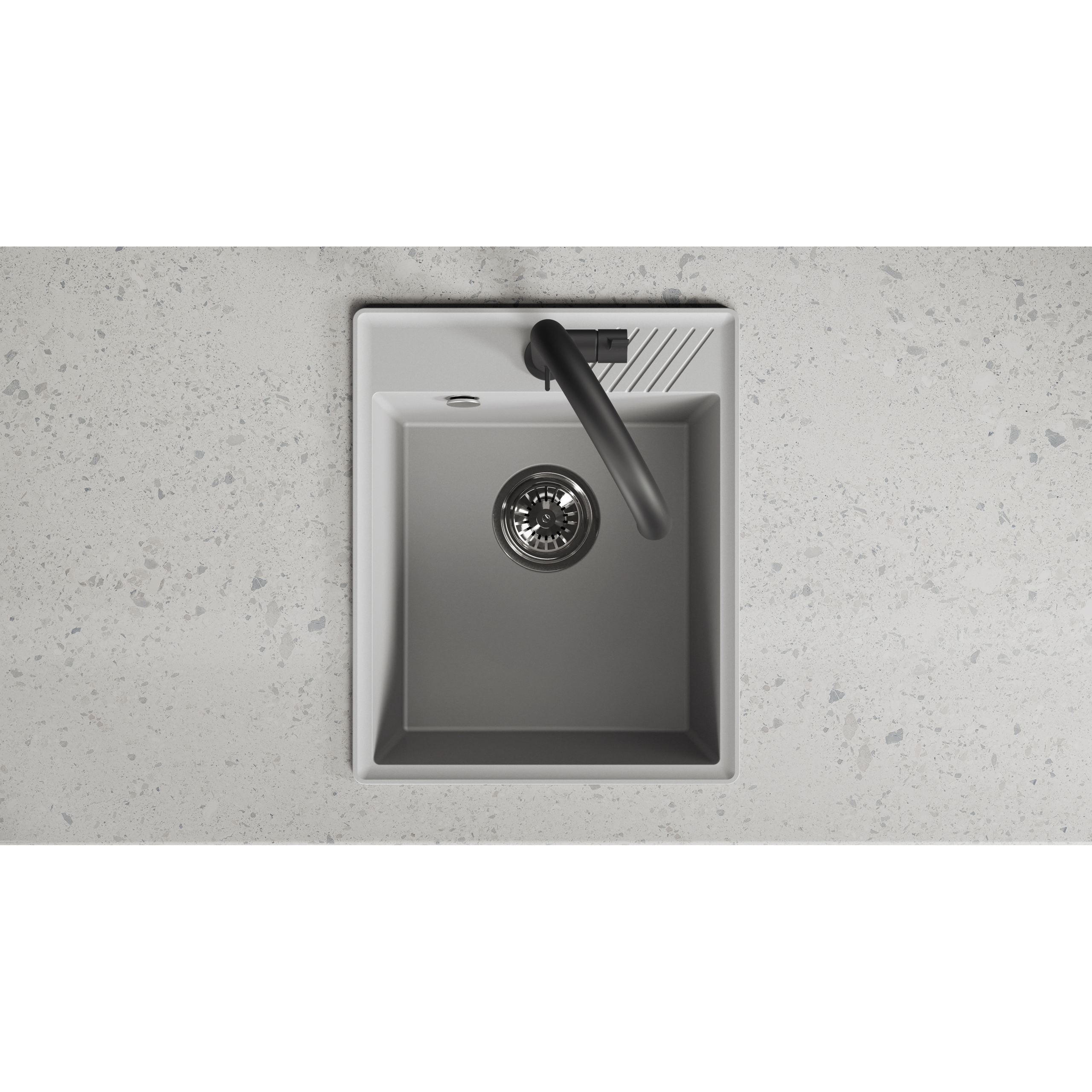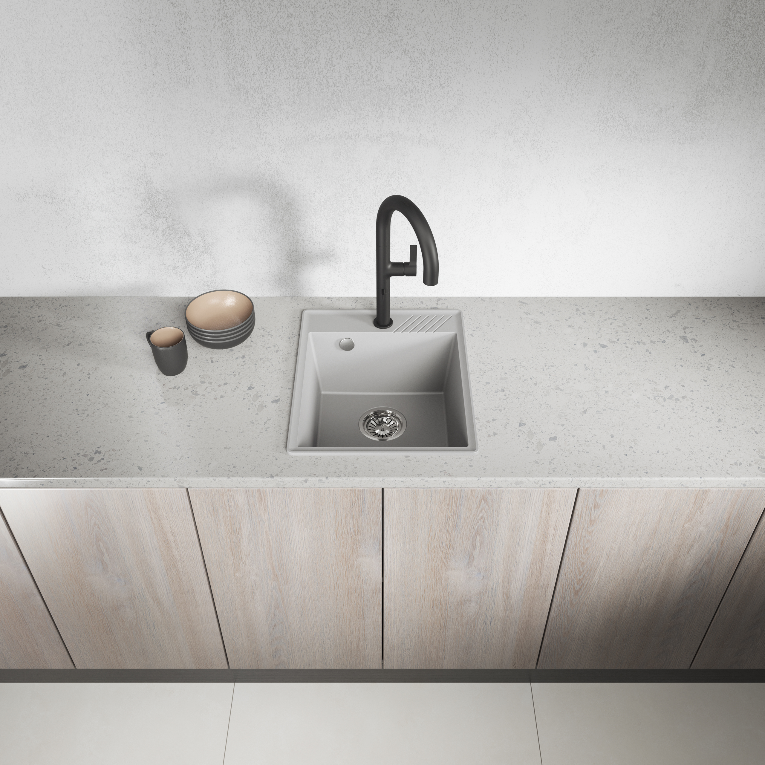 Szary zlewozmywak granitowy Hub to uniwersalne rozwiązanie do nowoczesnych kuchni, w których dominuje prostota i spójność stylistyczna. Neutralny kolor doskonale komponuje się z betonem, drewnem i stalą, tworząc spokojne, uporządkowane wnętrze. Kompaktowy format sprawia, że model Hub idealnie wpisuje się w kuchnie o ograniczonej przestrzeni, nie tracąc przy tym funkcjonalności.