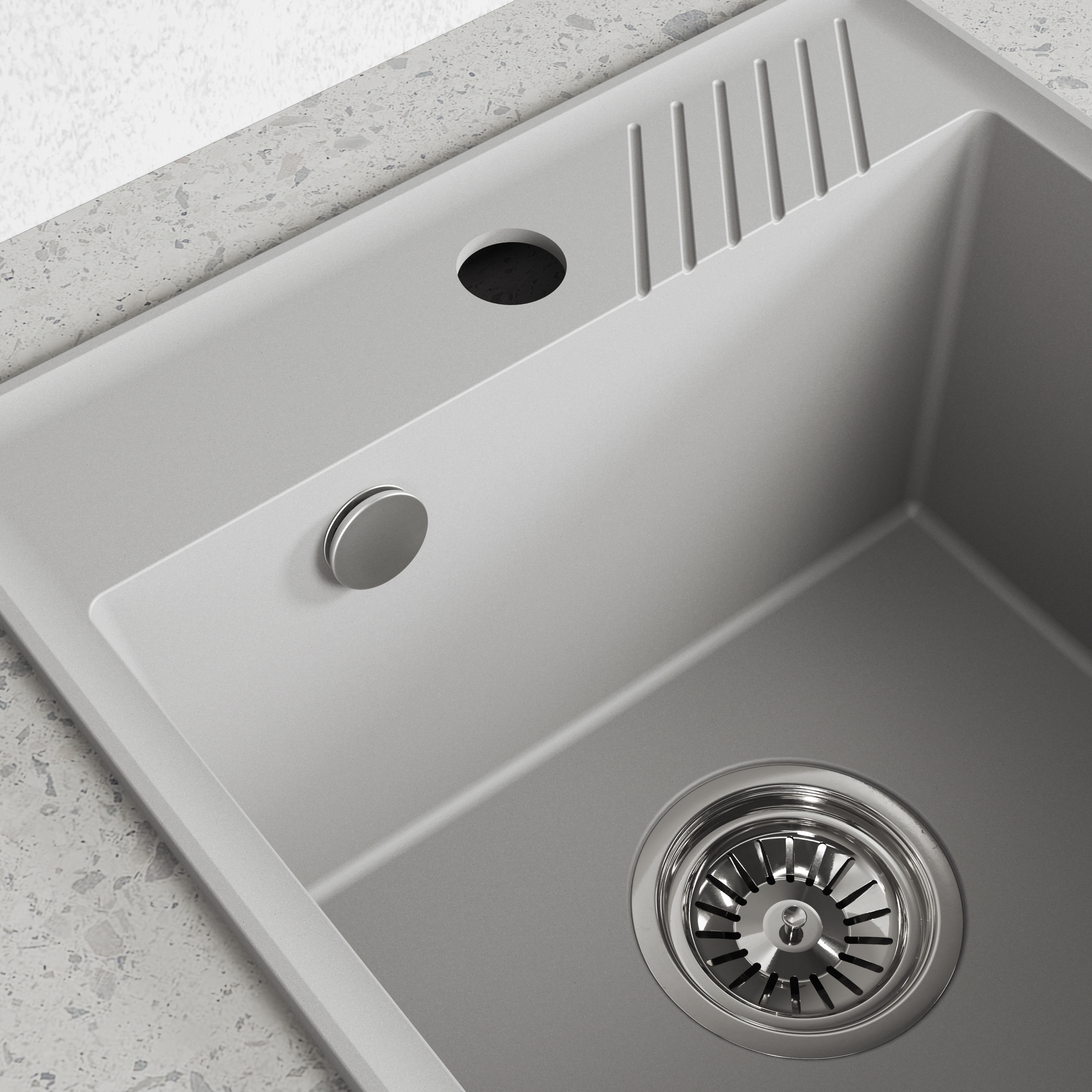 Komora zlewozmywaka Hub szarego została zaprojektowana tak, aby zapewnić komfort nawet przy intensywnym użytkowaniu. Pozwala na swobodne manewrowanie naczyniami, a kompaktowa forma sprawia, że zlewozmywak doskonale sprawdza się w kuchniach o niewielkim metrażu. Dodatkowe detale pomagają uporządkować strefę zmywania.