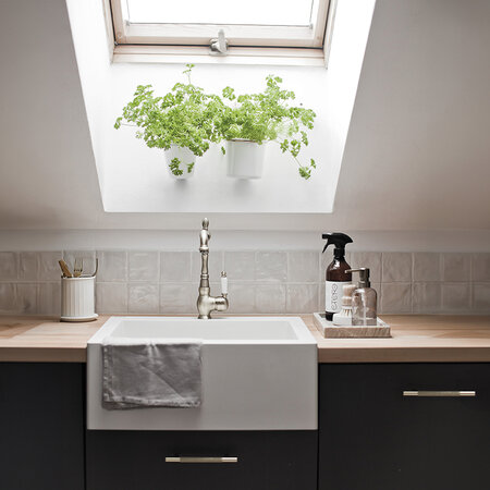 Zlewozmywak z widocznym kołnierzem (fartuchem), odpowiednik modnych zlewów ceramicznych.