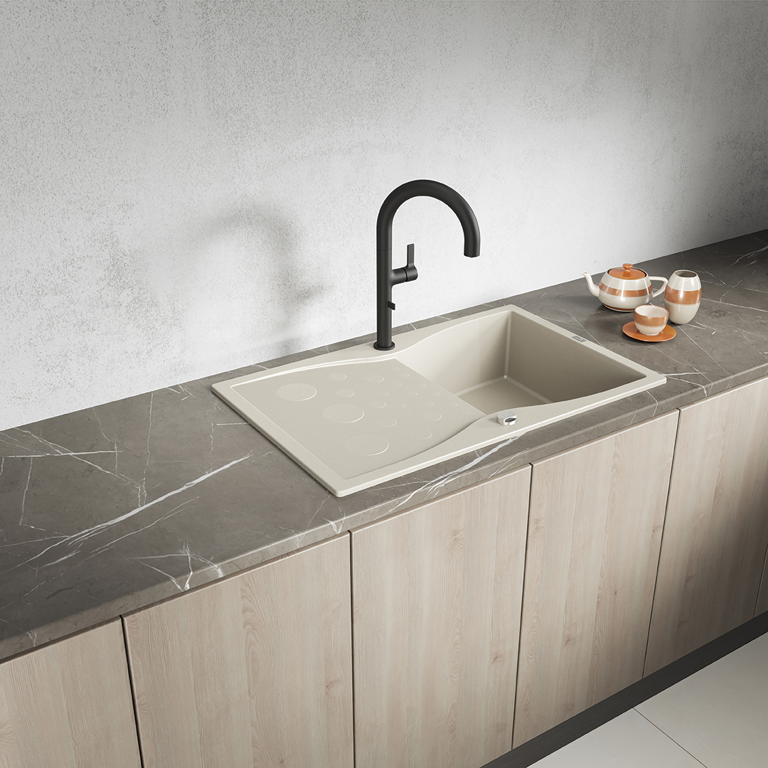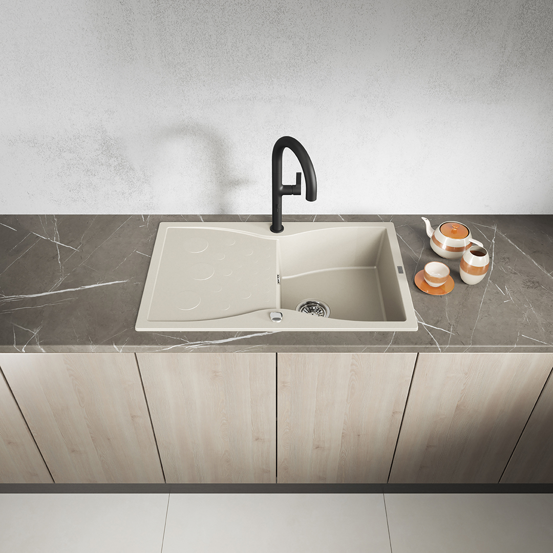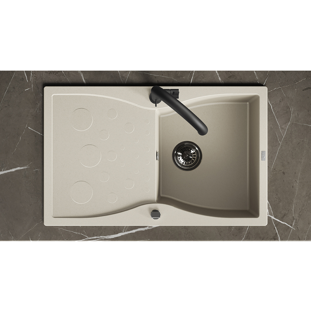 Wykonany z wysokiej jakości granitowego kompozytu, zlewozmywak jest odporny na zarysowania, wysokie temperatury, przebarwienia oraz szok termiczny. Beżowy odcień zachowuje swój kolor na lata, nawet przy intensywnym użytkowaniu. To inwestycja w jakość, która się opłaca.
