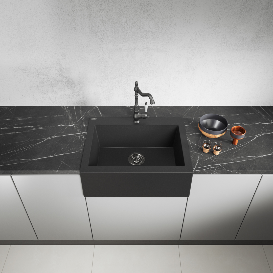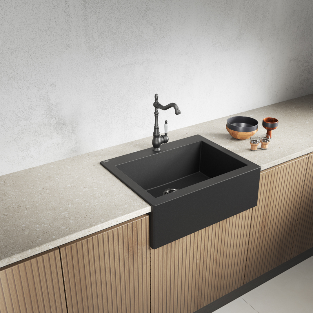 Zlewozmywak z widocznym kołnierzem (fartuchem), odpowiednik modnych zlewów ceramicznych.