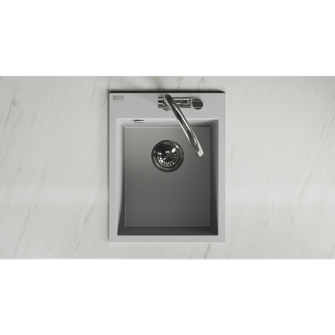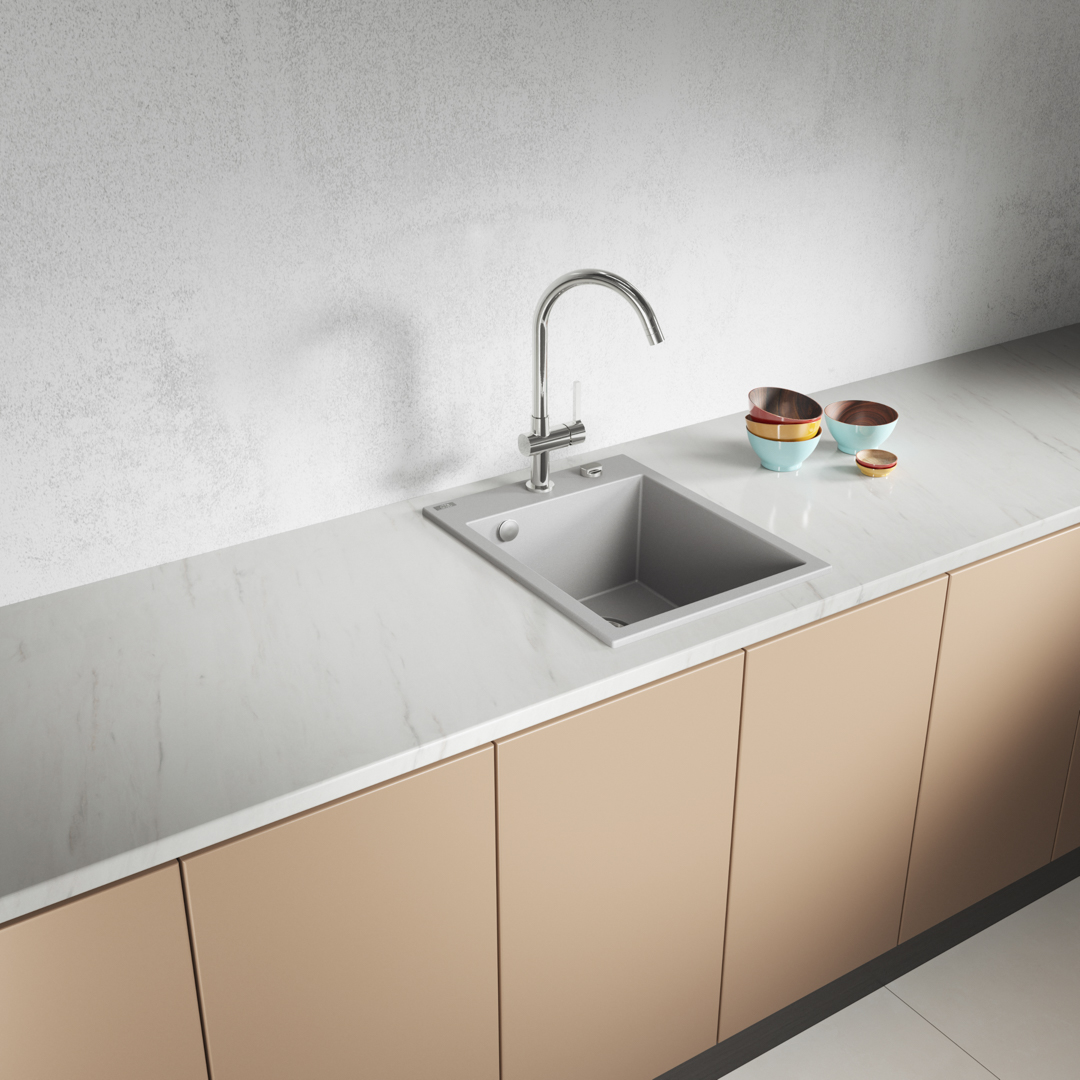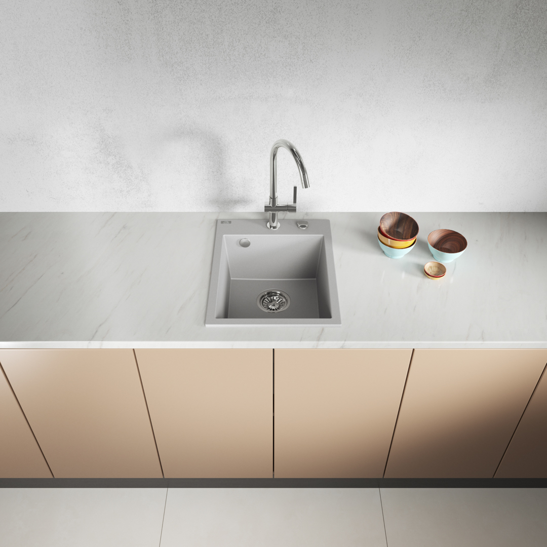 Zlew Monchichi to propozycja do niewielkich kuchni. Jego rozmiary umożliwiają montaż w 40-centymetrwej szafce. Szare wykończenie idealnie podkreśli wystrój wnętrz w stylu klasycznym i nowoczesnym. Największą zaletą modelu jest możliwość wybrania jednego z trzech miejsc do wybicia otworu pod baterię, korek czy dozownik na płyn do naczyń. Dodatkowo zlewozmywak można obrócić o 90 stopni i zainstalować w dowolnym ustawieniu względem krawędzi blatu.