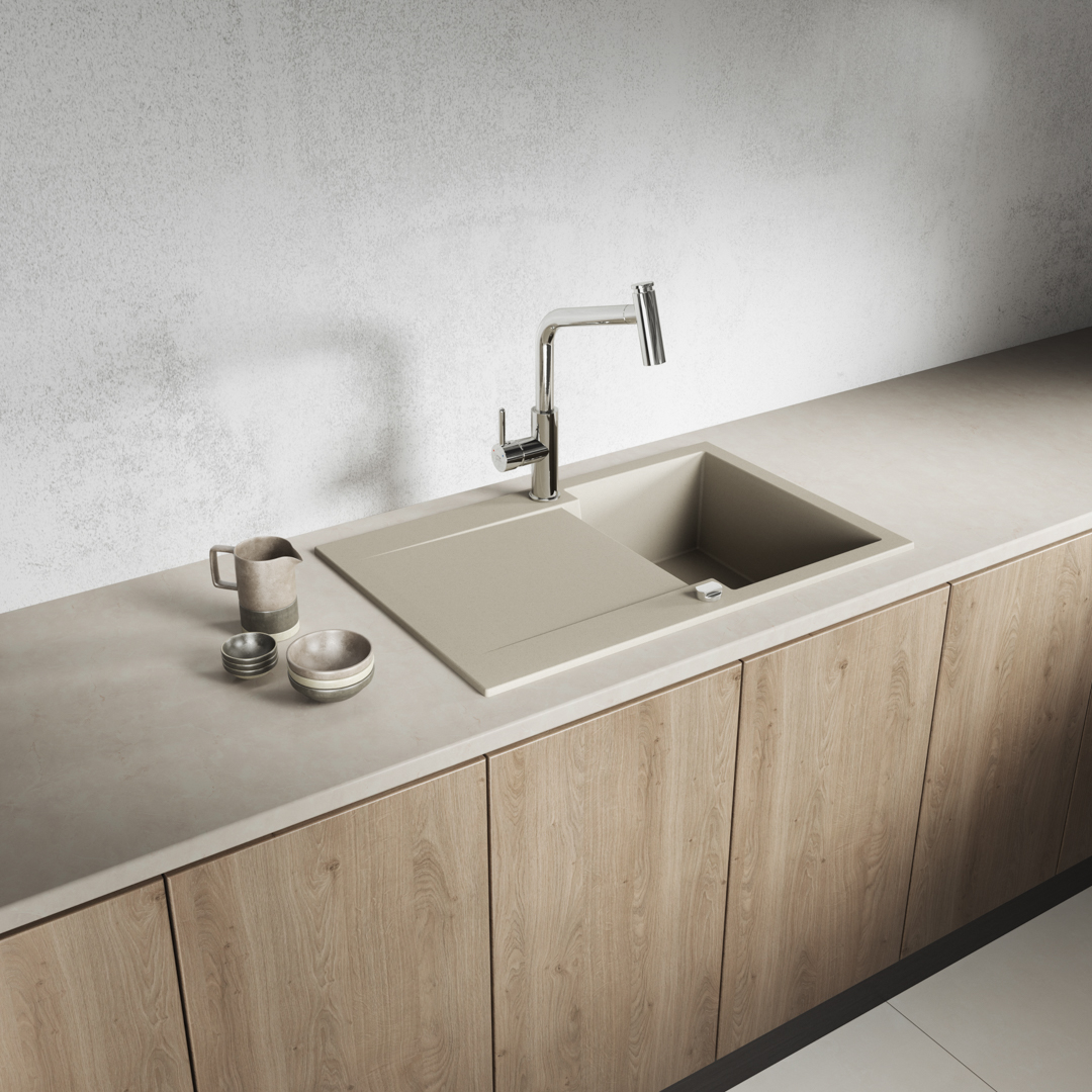 Seria de chiuvete Chichi marca Laveo este soluția perfectă pentru cei care amenajează bucătării mici, în special în apartamentele de bloc. Proiectele create de Maria Kubiak includ modele cu o singură cuvă, cu jumătate de picurător și cu picurător complet, oferind diversitate pentru a se potrivi nevoilor individuale. Varianta minimalistă cu o singură cuvă va funcționa bine în spații compacte, în timp ce opțiunile cu picurătoare oferă spațiu suplimentar pentru uscarea vaselor și a accesoriilor de bucătărie, sporind funcționalitatea chiuvetei.