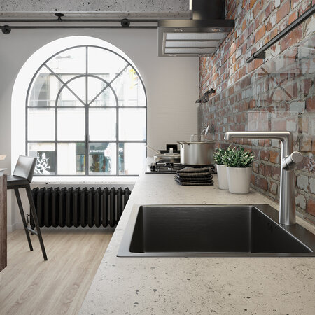 O caracteristică unică a tuturor modelelor Marmara este că pot fi instalate în trei moduri. Chiuvetele sunt cel mai adesea folosite ca modele încastrate. Aceasta este de departe cea mai simplă metodă de instalare, necesitând doar tăierea unei găuri de dimensiuni corespunzătoare. Dacă avem la îndemână instrumentele potrivite, putem face acest lucru singuri. Marmara poate fi, de asemenea, instalată din partea inferioară a dulapului - instalare suspendată, dar vă rugăm să rețineți, că această soluție necesită un blat special, realizat din materiale rezistente la umiditate, cum ar fi piatra sau marmura. Cea de-a treia metodă de instalare, care necesită o pregătire precisă a găurii, este instalarea la același nivel cu blatul. Este suficient să efectuați o tăietură mai adâncă cu câțiva milimetri, pentru a ascunde marginea chiuvetei. Această opțiune va fi ideală pentru cei care au un blat de lucru din lemn în bucătărie și doresc o suprafață uniformă care să fie ușor de menținut curată, fără colțuri în care se pot acumula firimituri și alte resturi.