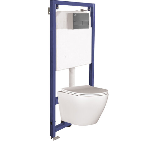Комплект DESNA, состоящий из тонкой рамы скрытого монтажа и унитаза - это удобное решение для людей, которые не хотят тратить время на комплектование индивидуальных элементов для ванных комнат. Устойчивая рама грузоподъемностью до 400 кг имеет систему смыва и бесшумный клапан наполнения. Безободковый унитаз легко чистится, оснащен сиденьем для унитаза с функцией медленного закрывания и системой easy-off, которая позволяет тщательно мыть его под душем. В комплект входят двухсекционная хромированная кнопка и все монтажные элементы.