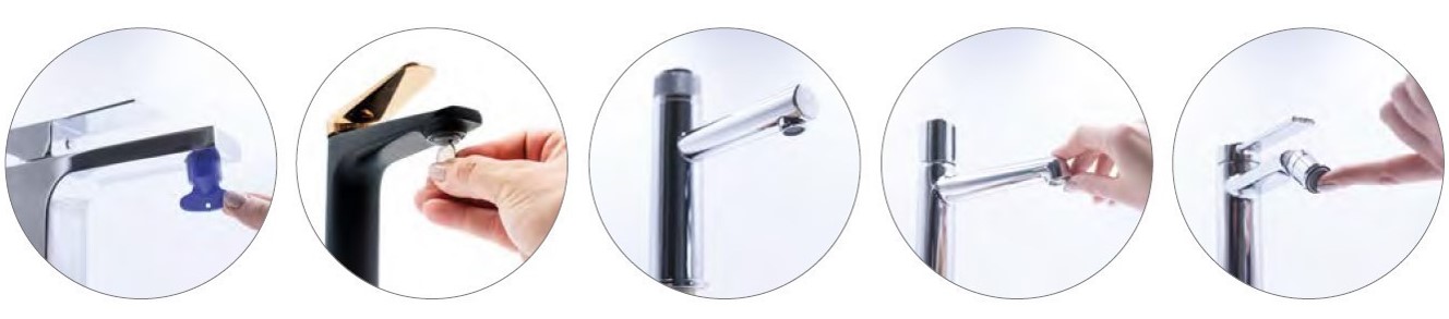 В отверстии на конце излива находится аэратор, т.е. специальное «сито», которое аэрирует вытекающую из крана воду. Благодаря увеличению объема струи потребляется меньше воды, что также приводит к уменьшению счетов. Аэраторы хоть имеют небольшой размер, но могут иметь дополнительные, очень полезные функции. Одной из них является система защиты от известкового налета, которая особенно полезна при работе с твердой водой. Благодаря специальным силиконовым выступам известковый осадок, забивающий кран, можно устранить, проведя по аэратору пальцем. Подвижные аэраторы с возможностью изменения наклона позволяют плавно регулировать угол струи воды из излива, что особенно удобно для владельцев умывальников необычной формы. Коррекция струи поможет минимизировать, например, разбрызгивание воды на дно или стенки умывальника.
