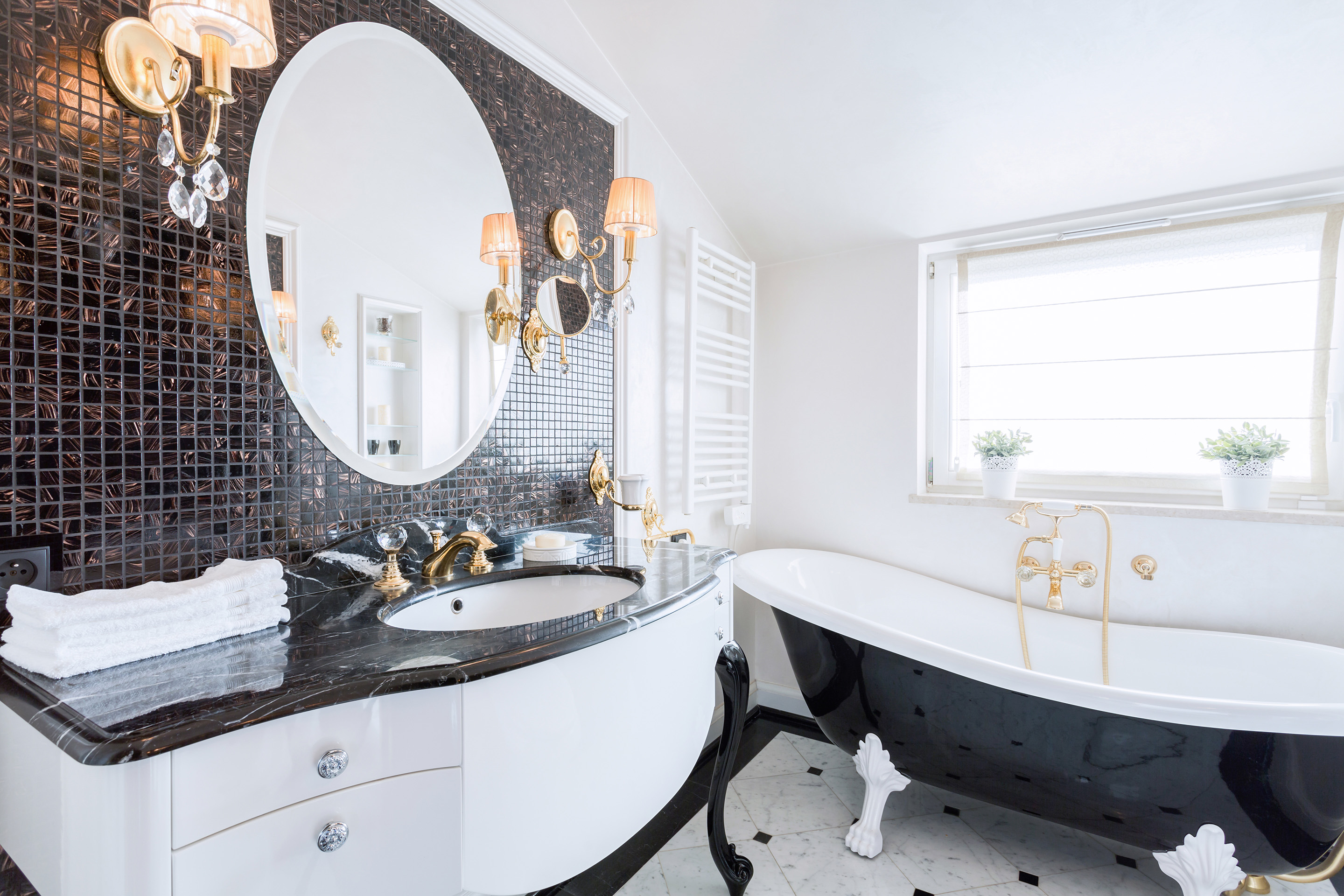 Blask i przepych - tak najkrócej można opisać łazienkę w stylu glamour. Styl ma różne oblicza - klasyczne, pałacowe, nowoczesne - jeśli więc komuś kojarzy się jedynie z różowo-złotym kiczem, jest to błędne skojarzenie. Urządzić taką łazienkę nie jest łatwo - trzeba zachować umiar, inaczej bogactwo form i kolorów sprawi wrażenie natłoku, tandety. Meble z oryginalnym designem i niecodziennym wykończeniem, kryształowe żyrandole, bogato zdobione płytki, intensywne kolory (złoto, srebro, czerń), luksusowo wyglądające przedmioty ze szkła - tego wszystkiego w łazience glamour nie może zabraknąć.