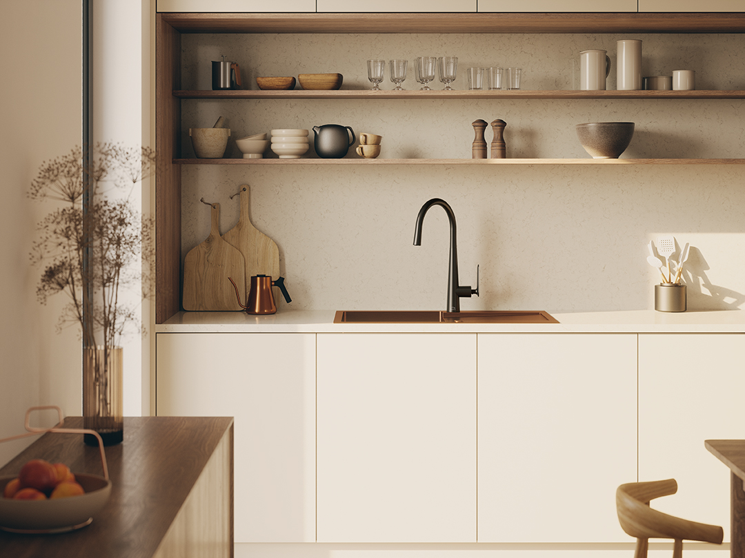 W 2025 roku schemat kolorystyczny kuchni będzie harmonijnie balansować pomiędzy kojącymi neutralami a energetycznymi akcentami. Bohaterami będą odcienie, które czerpią inspirację z naturalnych elementów, takich jak pustynie i lasy. W zestawie kolorów znajdziemy połączenie odcieni gliny, piasku, kamienia i roślinności, które wprowadzą do kuchni przytulność i spokój. W tej palecie biele i szarości ustąpią miejsca ciepłym brązom, beżom oraz zieleniom, tworząc atmosferę harmonii. Monolityczne odcienie będą odzwierciedleniem ewolucji natury oraz ukrytego bogactwa, które w końcu zyskuje na znaczeniu. Szczególną uwagę zwraca się na odcienie ochry, przechodzące w cynamon i głębokie brązy, które przywołują spokój leśnych zakątków i inspirują wiejskim urokiem.