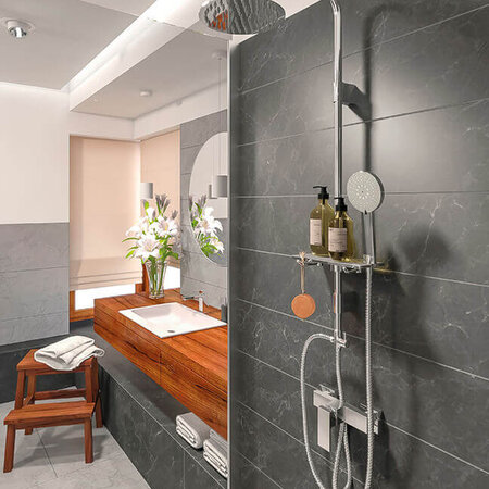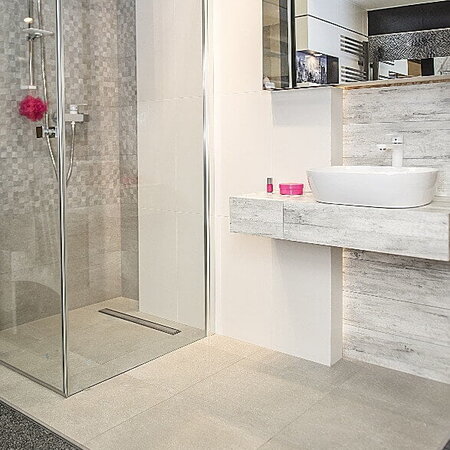Erstens ist eine Dusche eine gute Möglichkeit, zu sparen. Der mittlere Wasserverbrauch bei dieser Form des Badens ist wesentlich geringer als es bei der Badewanne der Fall ist. Außerdem gewinnt man so Platz. Kann man denn die Nutzfläche und die Zahl der verwendeten Materialien noch mehr reduzieren? Allerdings. Man kann auf die traditionelle Dusche verzichten, wenn man eine Linienentwässerung verwendet. Dann können Sie die Duschkabine entfernen. Auch die kleinste Duschkabine schränkt nämlich die Bewegungsfreiheit ihrer Nutzer ein. Wenn man statt der rechteckigen eine halbrunde wählt, gibt es die zwar die Chance auf eine etwas größere Fläche, aber das kann auf Kosten der Bequemlichkeit gehen. Tragen Sie also Sorge für Ihre Bequemlichkeit, und verwenden Sie die Wand des Raumes als Teil der Dusche und montieren Sie zusätzlich eine durchsichtige Seitenwand. Verzichten Sie auf das Duschbecken. Ein diskreter, unmittelbar auf dem Fußboden montierter Ablauf ermöglicht eine Ausführung des Fußbodens in der Dusche mit denselben Fliesen, die im gesamten Badezimmer verwendet wurden.