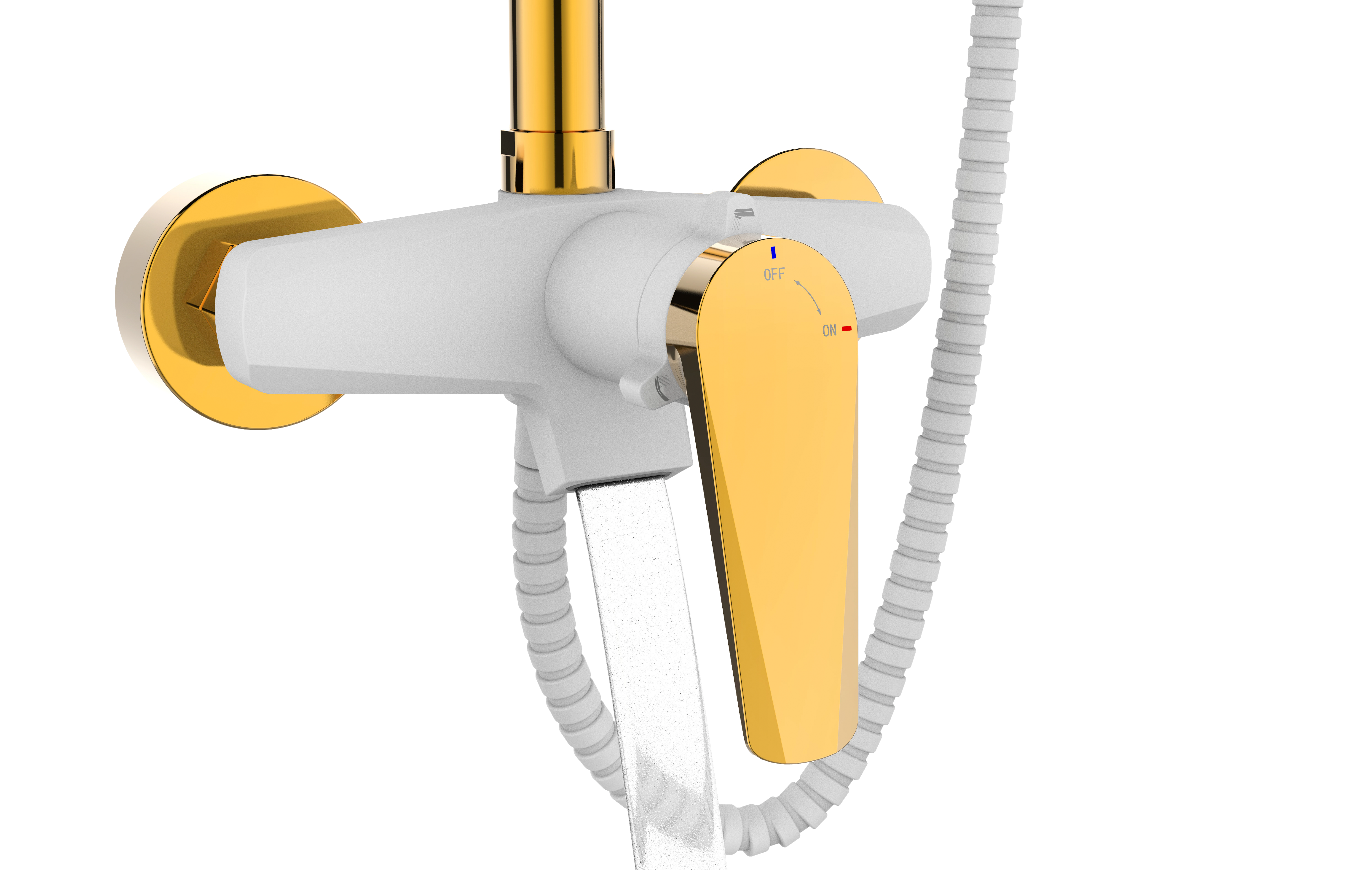 - A function switch is a small, two-stage lever serving to redirect water flow between the hand shower and the rain shower. For convenience purposes, it is usually placed at the very bottom of the column. Most of switches are ceramic ones that can work regardless of the water pressure. Another type are switches in the form of buttons. In exceptional cases - especially when there are more options available to switch between - they can take other forms, such as for example the ring in the Rubio column (rain shower - hand shower - spout). Close-ups on switches in Pinar, Rubio, Zorita and Drop columns.