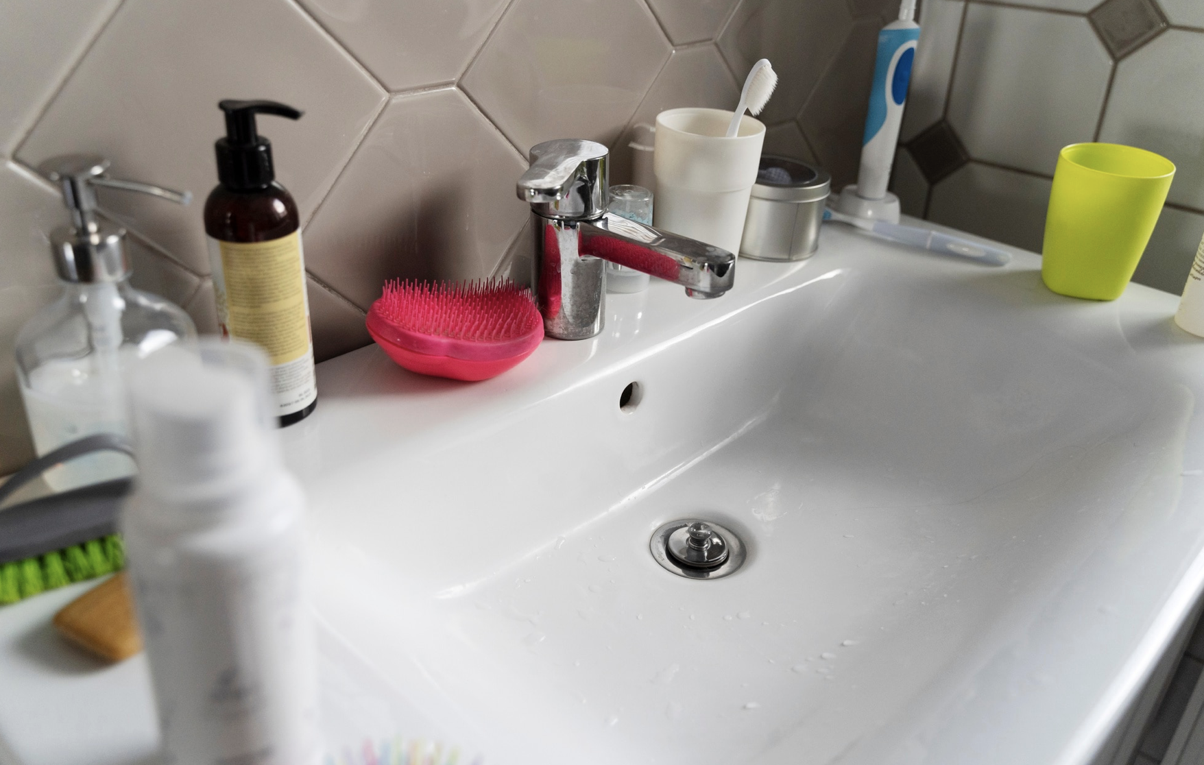 - a soap dispenser - placing your hand under the dispenser prevents soap and water from splashing and creating dried-on stains on the counter-top,