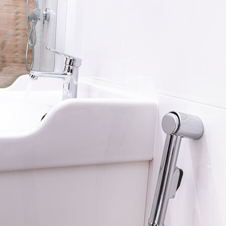 The simplest way to have a bidet without a bidet which can be implemented in any bathroom is to buy a single-point shower set. Just connect it to the washbasin mixer, and put a small hand shower in a special wall-mounted bracket. Also here, the comfort of use is so much affected by a button to start and stop the water stream.