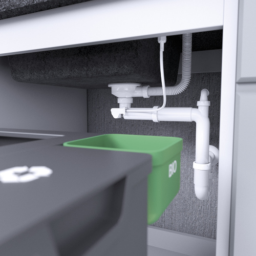 As a standard, Laveo sinks come with a SPACE SAVING siphon which pipes are shaped to fit closely to kitchen cabinet sides and thus allow to save space and use it to conveniently store cleaning products or arrange waste sorting bins.