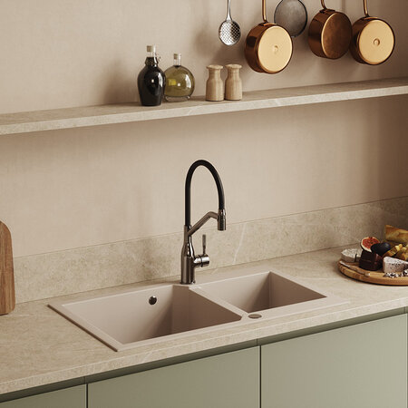 Bateria zlewozmywakowa Colina w wykończeniu chromowo-czarnym to połączenie nowoczesnej estetyki z niezrównaną wygodą użytkowania. Jej elegancka forma i precyzyjnie dopracowane detale sprawiają, że doskonale komponuje się zarówno z minimalistycznymi, jak i bardziej klasycznymi aranżacjami kuchennymi. Lśniący chrom w połączeniu z głęboką czernią tworzy efektowny kontrast, który podkreśla charakter wnętrza.