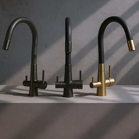 Bateria Riveco to perfekcyjne połączenie szczotkowanego złota i matowej czerni – eleganckiego duetu, który wprowadza do kuchni nie tylko funkcjonalność, ale i wyjątkowy styl. Ciepły odcień metalu dodaje wnętrzu wyrafinowania, natomiast czarne akcenty nadają mu nowoczesnej głębi. Ten projekt przyciąga uwagę i świetnie komponuje się zarówno z minimalistyczną zabudową, jak i klasycznymi materiałami, jak drewno czy kamień.