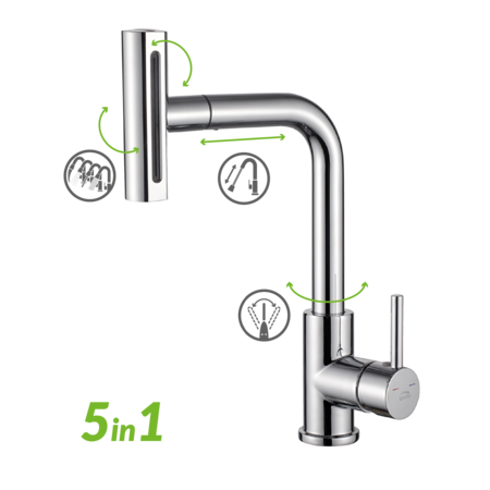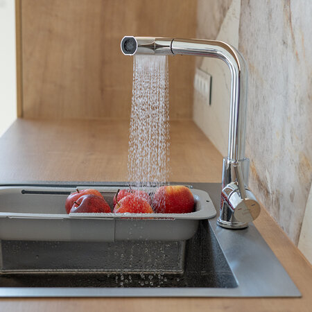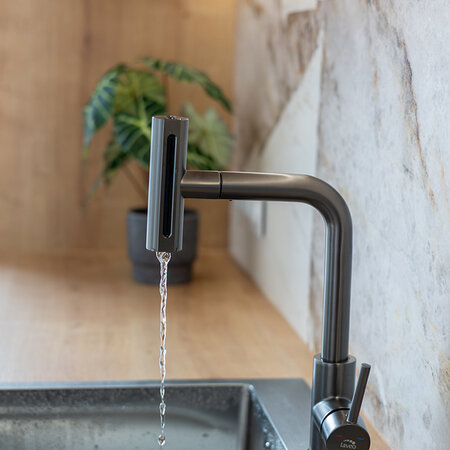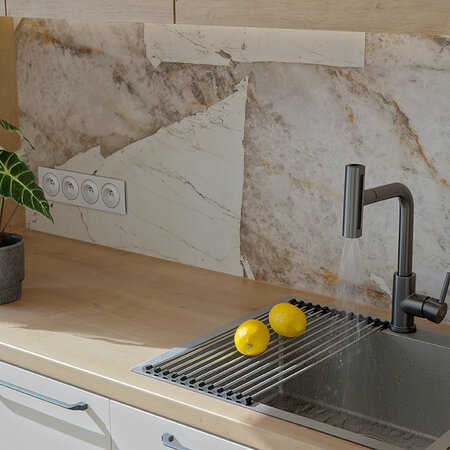Rotaro została wyposażona w wyciąganą, obracaną wylewkę, która daje pełną kontrolę nad strumieniem wody. Wystarczy jednym ruchem wysunąć wylewkę, aby wygodnie napełnić duży garnek, precyzyjnie opłukać warzywa lub dotrzeć do każdego zakamarka zlewozmywaka. Dzięki intuicyjnemu systemowi przełączania strumienia możesz jednym kliknięciem dostosować przepływ wody do swoich potrzeb.