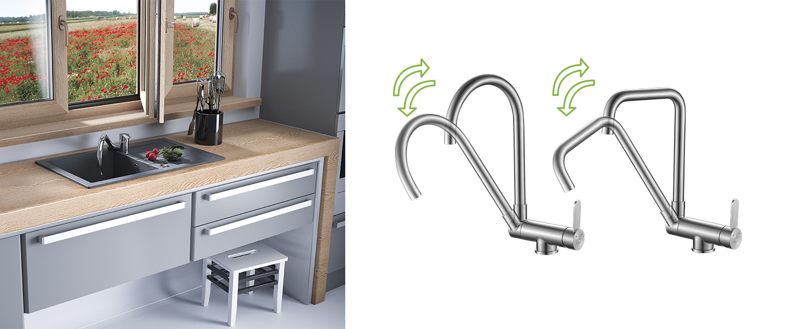 Modelele pliabile sunt un tip unic de baterii, care a luat naștere cu gândul la chiuvete situate sub fereastră. Datorita faptului că pipa lor poate fi ascunsă în compartimentul chiuvetei, putem deschide larg fereastra pentru a o spăla sau pentru a aerisi încăperea.