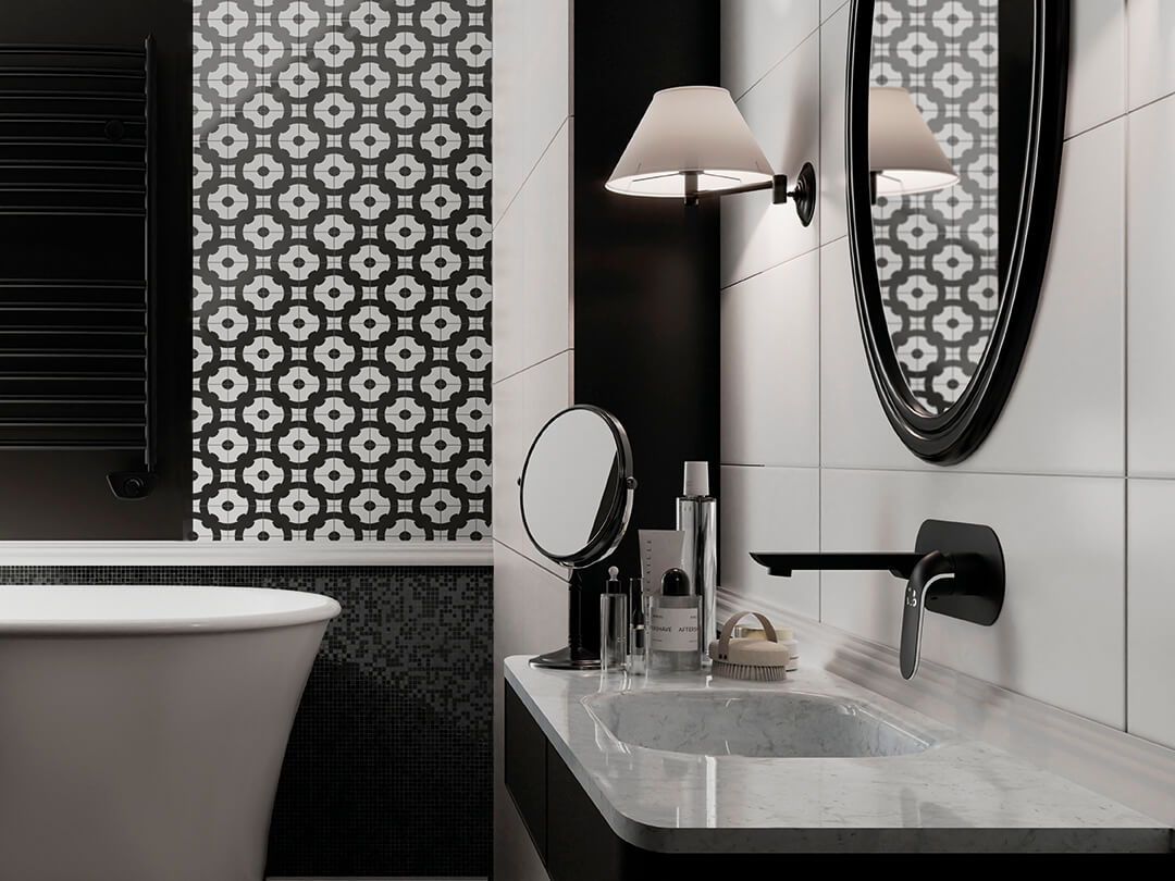 Cu toate acestea, efectul glamour poate fi realizat cu succes în moduri mai puțin invazive, investind în accesorii elegante. Este suficient să schimbați oglinda cu una cu ramă masivă, decorativă, realizată din lemn sculptat sau metal. O altă posibilitate o reprezintă schimbarea bateriei - în portofoliul Laveo merită să acordați o atenție specială uneia dintre cele mai recente serii ZORITA. Bateriile și dușurile sale sunt disponibile în două finisaje: alb și negru, care sunt completate de o dungă subtilă cromată pe pipă și pe maneta bateriei.