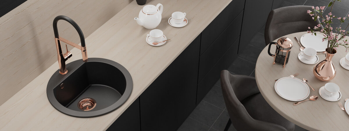 Dacă suntem în etapa de renovare și decidem că aurul ar trebui să apară pe elementele de perete sau pe mobilier, merită să le combinați cu alb, acest lucru permite o amenajare interioară mai îndrăzneață, datorită căreia bucătăria va rămâne deopotrivă confortabilă și elegantă . Există, de asemenea, posibilitatea introducerii aurului fără un portofel gros sau intervenţii radicale, cum ar fi schimbarea plăcilor de faianţă. Trebuie amintit că detaliile oferă întregul caracter, iar în cazul unei bucătării avem o mulțime de posibilități! O mică procedură, cum ar fi schimbarea unei lămpi sau a mânerelor dulapurilor, va da impresia de lux. Borcane aurii pe blatul mesei, un ceas pe perete sau ghivecele pentru mirodenii sunt elementele cel mai rapid și mai ușor de înlocuit. Cu toate acestea, bucătăria este locul care poate verifica rapid legitimitatea accesoriilor decorative, așa că, pe lângă rolul decorativ, merită să le faceți și funcționale. Produsele Laveo îşi au aici locul cu siguranță . Seria de baterii Evora are un finisaj cu aspect de aur și cupru patinat, astfel de baterii pot fi asortate cu ușurință la o chiuvetă din granit cu finisaj alb, bej sau negru. O altă sugestie este o baterie minimalistă Pola finisată în roz auriu cu o pipă mobilă și flexibiăl, de culoare neagră. Acestea pot fi completate cu o chiuvetă din oțel Marmara disponibil în finisaj grafit și roz auriu.
