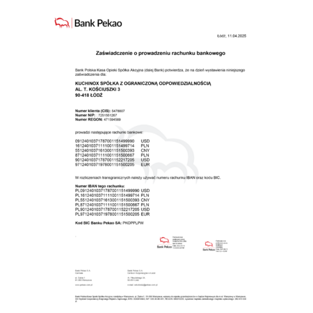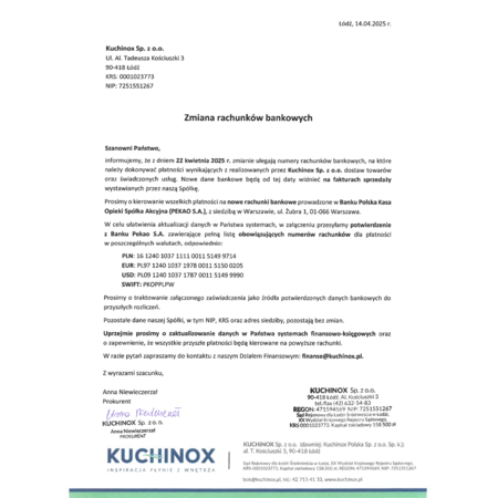 Dorim să vă informăm că, începând cu data de 22 aprilie 2025, se modifică numerele conturilor bancare pentru plățile aferente livrărilor de produse și serviciilor prestate de Kuchinox Sp. z o.o. Începând cu această dată, noile date bancare vor fi afișate pe toate facturile de vânzare emise de compania noastră.