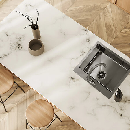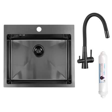 Chiuvetele pot fi montate fie aplicat pe blat, fie la nivelul acestuia, în funcție de preferințe. Seria include și seturi cu dozator de detergent, grătar rulabil, sită de scurgere pentru fructe și obiecte mici, precum și variante complete cu bateria de bucătărie Riveco cu sistem de filtrare integrat. Această baterie elegantă, cu dublu mâner, permite comutarea ușoară între apă filtrată și nefiltrată – o soluție ecologică și practică.
