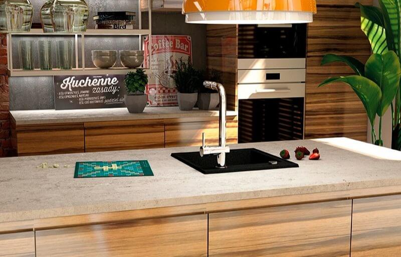Двухкамерная гранитная раковина Celia или Madagaskar, встроенная в остров, обеспечит максимальный комфорт в повседневных делах.
