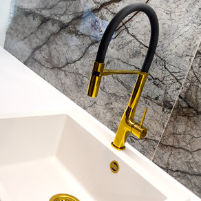 Laveo предлагает новую версию смесителя для кухонной мойки Pola с гибким изливом. Сочетание золотистого корпуса с черным шлангом – седьмая цветовая версия этой модели.