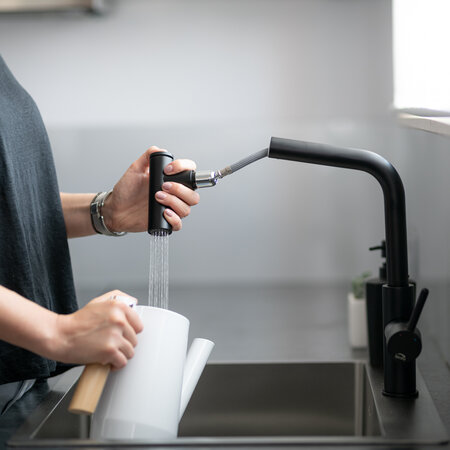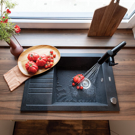 Смеситель для мойки TORO - оригинальная модель, разработанная для современных кухонь. Характерный конец излива- помимо декоративных преимуществ, скрывает удобный переключатель струи воды с постоянной на „дождь”, что особенно удобно при ополаскивании овощей и фруктов. Выдвижной излив повышает комфорт повседневной деятельности. Смеситель доступен в двух вариантах отделки: хром и черный.