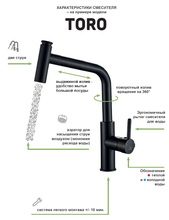Помимо этих более широко описанных характеристик, при выборе кухонного смесителя стоит обратить внимание на:
